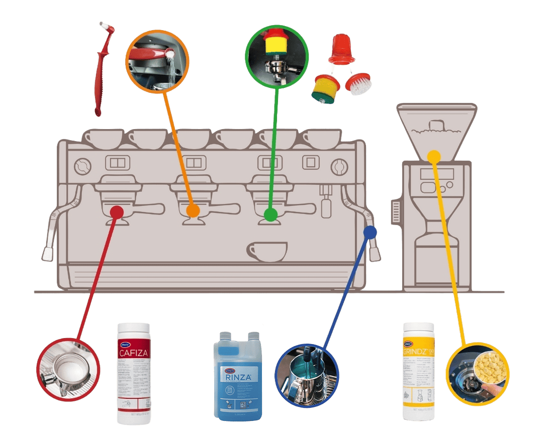 Combiná los distintos productos Urnex para mantener cada parte de tu equipo limpia y funcionando al 100%.